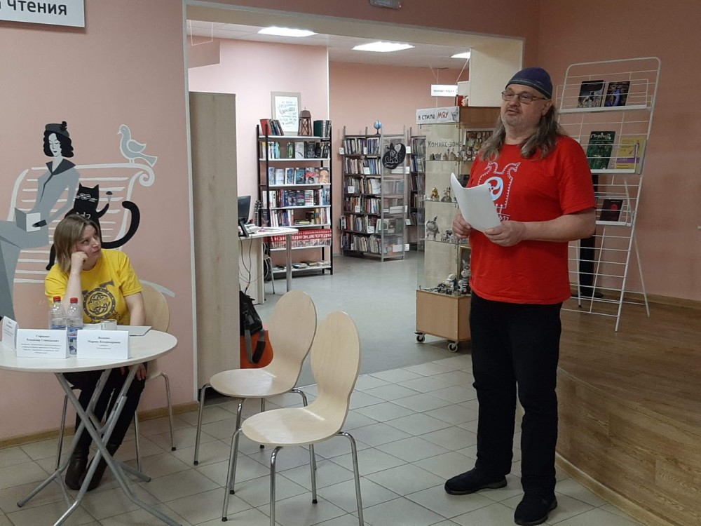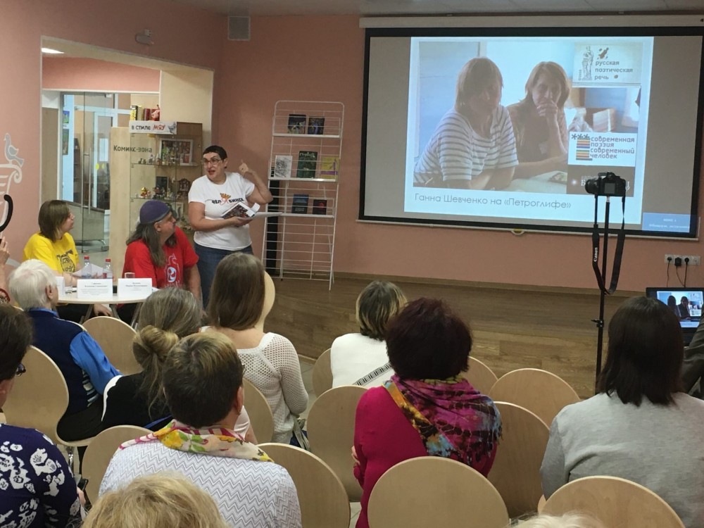 На встрече с читателями в библиотеке были представлены стихи современных поэтов - участников литературного фестиваля "Петроглиф" (Республика Карелия) и творческих проектов Марины Волковой ("Фестиваль анонимной поэзии", "Блиц Лиц", "Оплоты", "ЧеКа", "Русская поэтическая речь", "Паровозъ", "Современная поэзия Современный человек"): Светлана Василенко (г. Москва), Андрей Коровин (г. Москва), Ганна Шевченко (Московская обл.), Сергей Золотарев (Московская обл.), Герман Власов (г. Москва), Андрей Щербак-Жуков (г. Москва), Нури Бурнаш (Казань), Виталий Кальпиди (г. Челябинск).